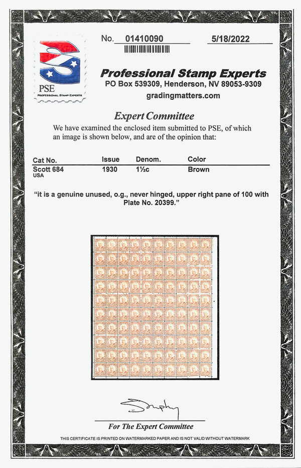 7372 nhbl 684 image1930, 1½¢ Harding, rotary press printing (Scott 684), top right full pane of 100 with plate number 20399, o.g., never hinged, Post Office fresh and sound, Very Fine, with 2022 P.S.E. certificate.