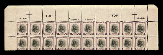 7393 nhbl 832 image1938, Presidential Issue, $1 Wilson (Scott 832), plate block of 20, o.g., never hinged, Very Fine.