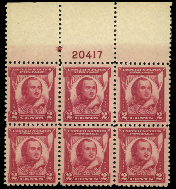 7374 nhbl 690 image1931, 2¢ Pulaski (Scott 690), top margin F plate block of 6, Handsome vibrant visual appeal, o.g., never hinged, Very Fine to Extremely Fine.