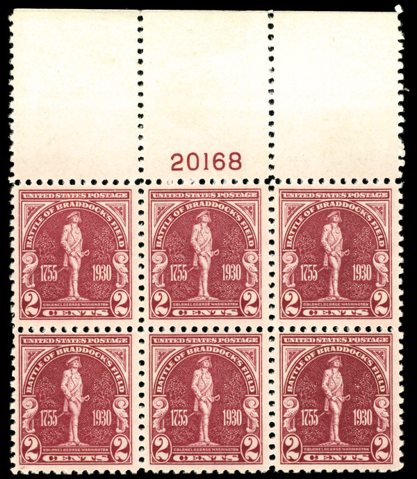 7373 nhbl 688 image1930, 2¢ Battle of Braddock's Field (Scott 688), plate block of 6, o.g., never hinged (minor gum skips), Very Fine to Extremely Fine.
