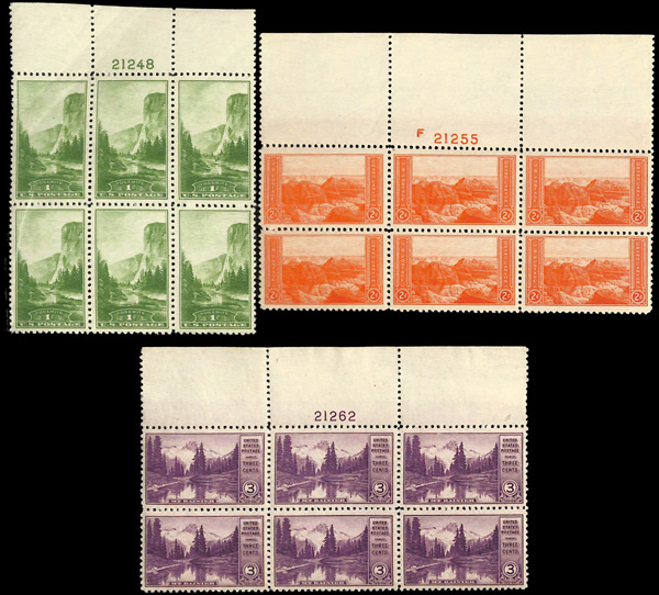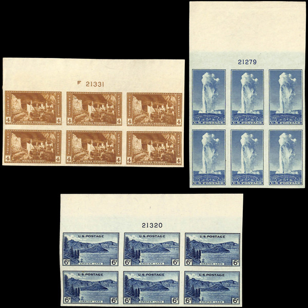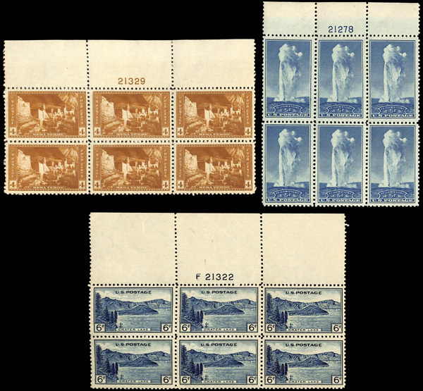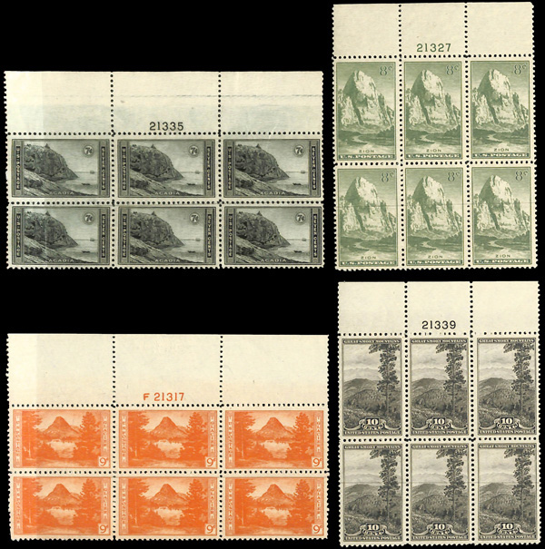 7387 nhbl 740-749 image1934, National Parks complete, perforated (Scott 740-749), plate blocks of 6, o.g., never hinged, Extremely Fine.