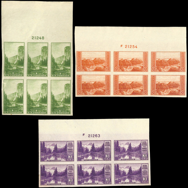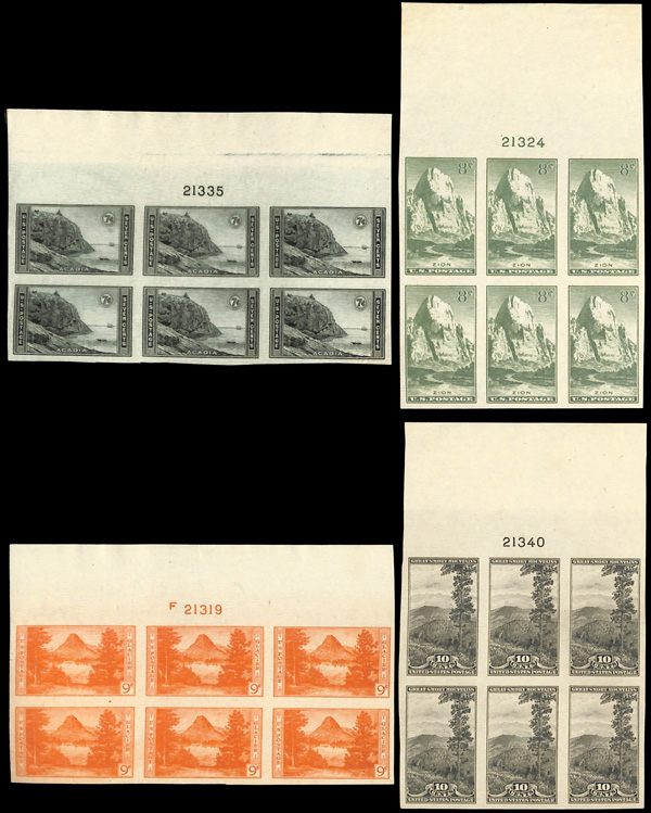 7389 ngbl 756-765 image1935, National Parks, imperf., 1¢ to 10¢ complete (Scott 756-765), set of 10, plate blocks of 6, without gum as issued, Very Fine to Extremely Fine.