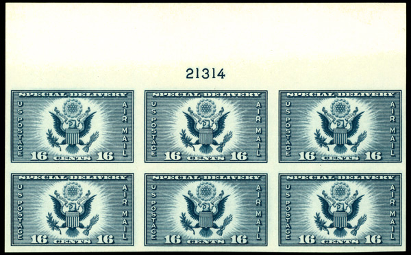 7390 ngbl 771 image1935, 16¢ Airmail Special Delivery, imperf. (Scott 771), plate block of 6, without gum as issued, Very Fine to Extremely Fine.
