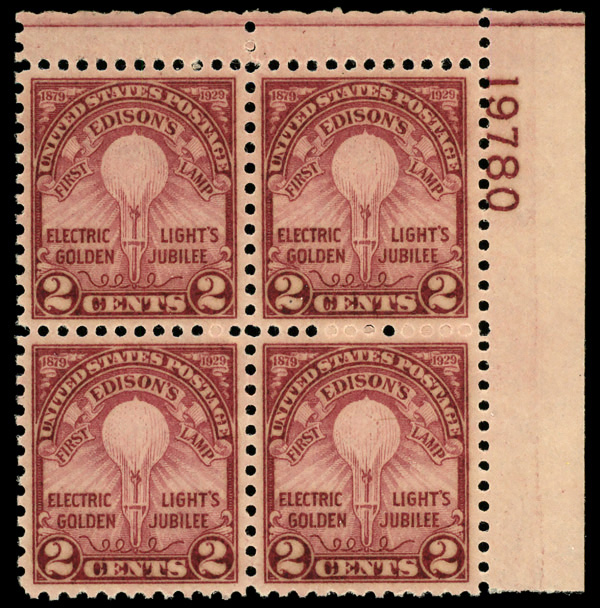 7362 nhbl 655 image1929, 2¢ Edison, rotary press printing (Scott 655), plate block of 4, o.g., never hinged, Extremely Fine.