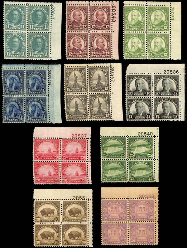 7375 nhbl 692-701 image1931, Rotary press definitives, 11¢ to 50¢ complete (Scott 692-701), set of 10, plate blocks of 4, o.g., never hinged, Very Fine to Extremely Fine.