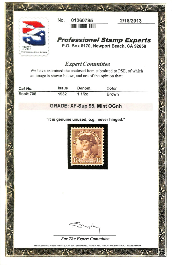 7379 nh 706 image1932, 1½¢ Washington Bicentennial (Scott 706), o.g., never hinged, Extremely Fine to Superb, with 2013 P.S.E. certificate graded XF-SUP 95.