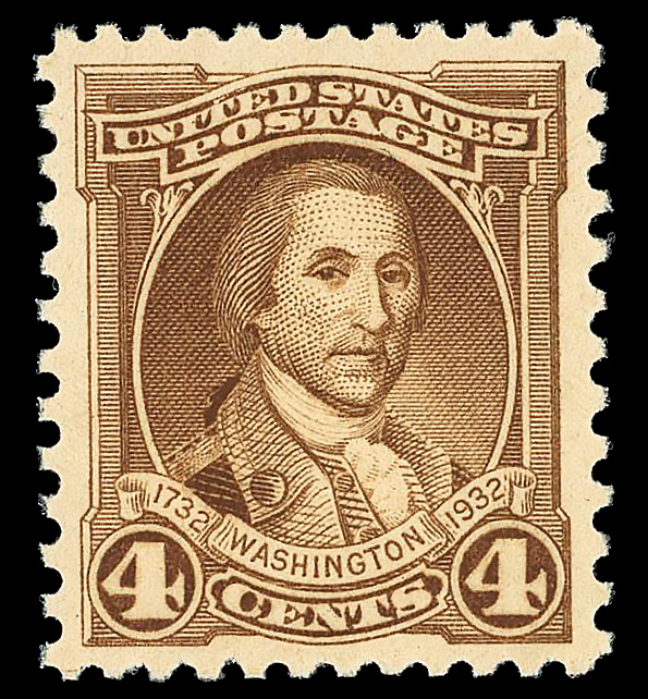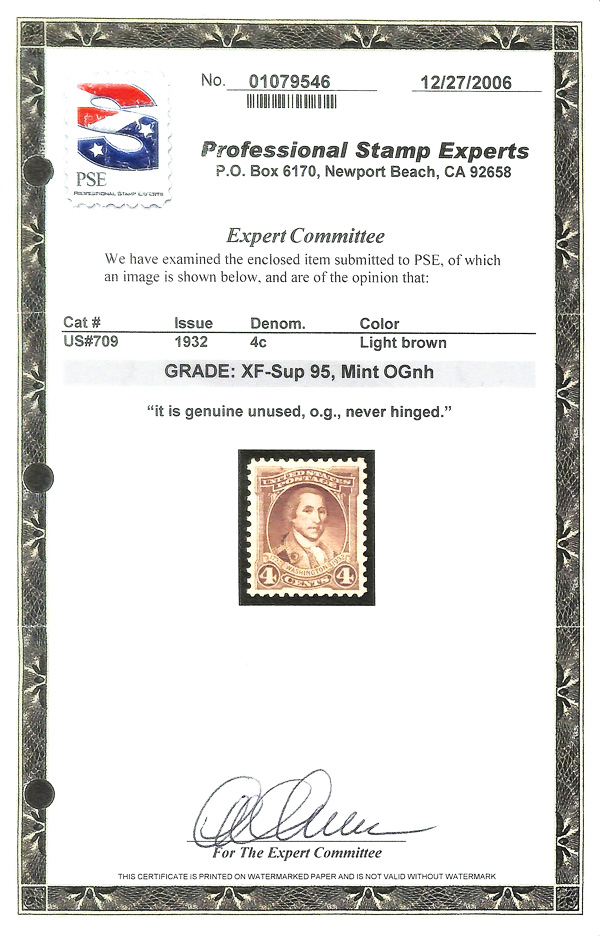 7380 nh 709 image1932, 4¢ Washington Bicentennial (Scott 709), o.g., never hinged, Extremely Fine to Superb, with 2006 P.S.E. certificate graded XF-SUP 95.