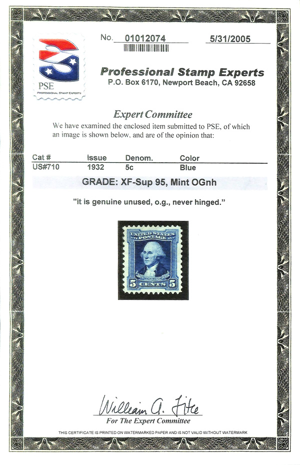 7381 nh 710 image1932, 5¢ Washington Bicentennial (Scott 710), o.g., never hinged, Extremely Fine to Superb, with 2005 P.S.E. certificate graded XF-SUP 95.