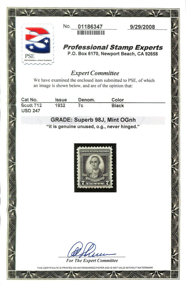 7382 nh 712 image1932, 7¢ Washington Bicentennial (Scott 712), o.g., never hinged, Superb, with 2008 P.S.E. certificate graded SUP 98J.