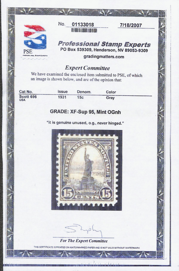 7376 nh 696 image1931, 15¢ Statue of Liberty, rotary press printing (Scott 696), o.g., never hinged, Post Office fresh with strong color and clean impression, all mathematically centered, Extremely Fine to Superb, with photocopy of 2007 P.S.E. certificate graded XF-SUP 95.