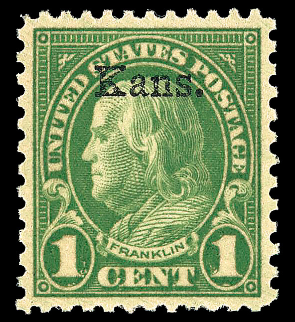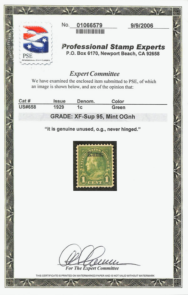 7365 nh 658 image1929, 1¢ Kans. (Scott 658), o.g., never hinged, Extremely Fine to Superb, with 2006 P.S.E. certificate graded XF-SUP 95.