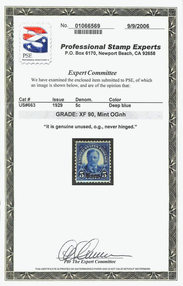 7366 nh 663 image1929, 5¢ Kans. (Scott 663), o.g., never hinged, Extremely Fine, with 2006 P.S.E. certificate graded XF 90.