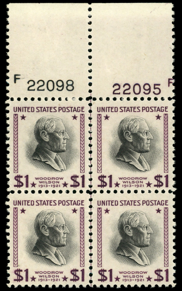7395 nhbl 832 image1938, Presidential Issue, $1 Wilson (Scott 832), plate block of 4, o.g., never hinged, Very Fine to Extremely Fine.