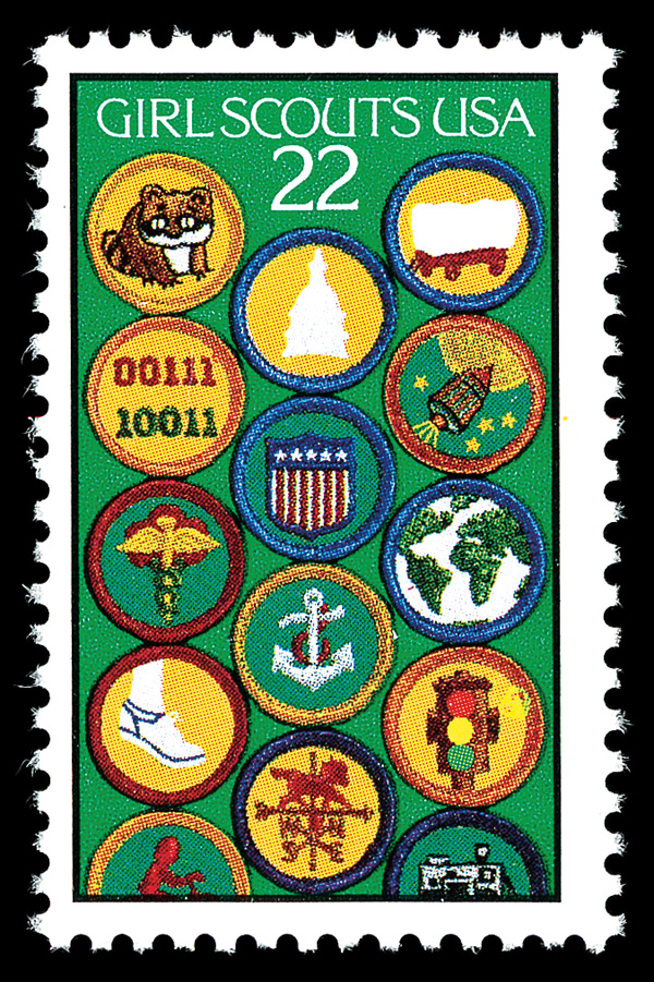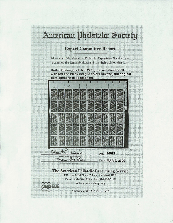 7412 nh 2251b image1987, 22¢ Girl Scouts, red & black (engraved) omitted (Scott 2251b), o.g., never hinged, pristine and bright, position 15 penciled on reverse; with normal single for comparison, Very Fine, with photocopy of 2000 A.P.S. certificate for entire pane of 50.