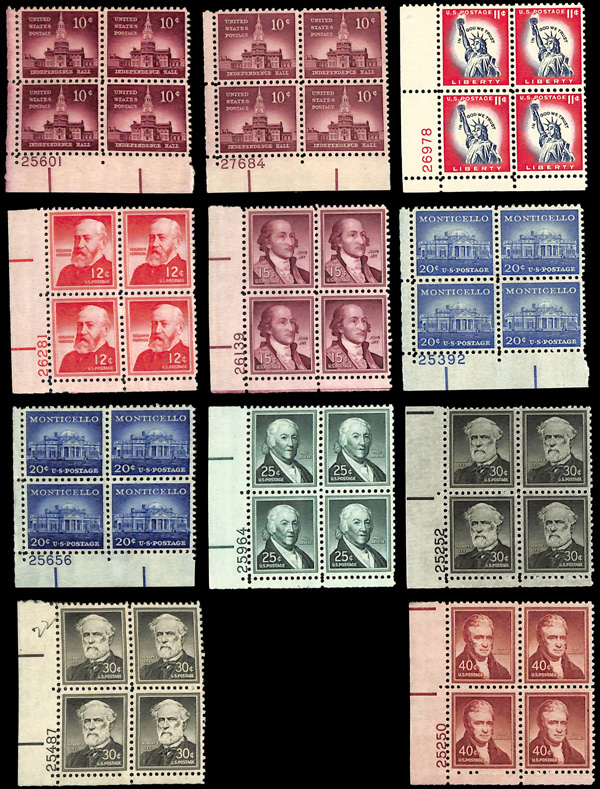 7404 ogbl 1030-1053 image1954, Liberty Issue complete (Scott 1030-1053), set of 41, plate blocks of 4, includes #1214 8¢ Pershing, Extremely Fine.
