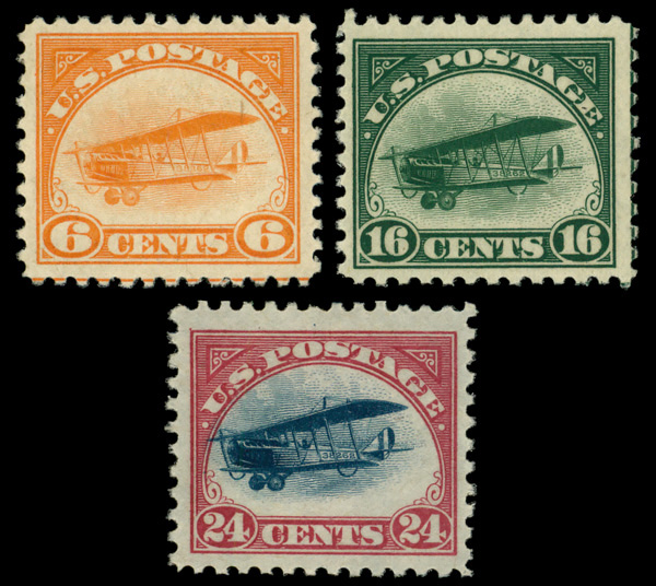 7428 og C1-C3 imageAirmail, 1918, First Issue, 6¢ to 24¢ complete (Scott C1-C3), set of 3, o.g., lightly hinged (6¢ small hinge remnant), Fine to Very Fine.