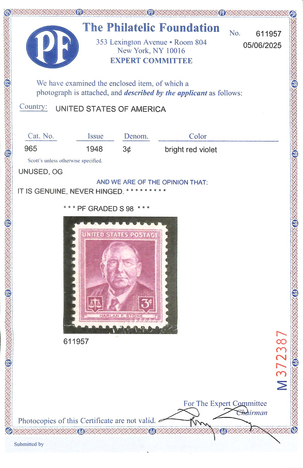 7401 nh 965 image1948, 3¢ Harlan F. Stone (Scott 965), o.g., never hinged, Superb, with 2025 P.F. certificate graded SUP 98.