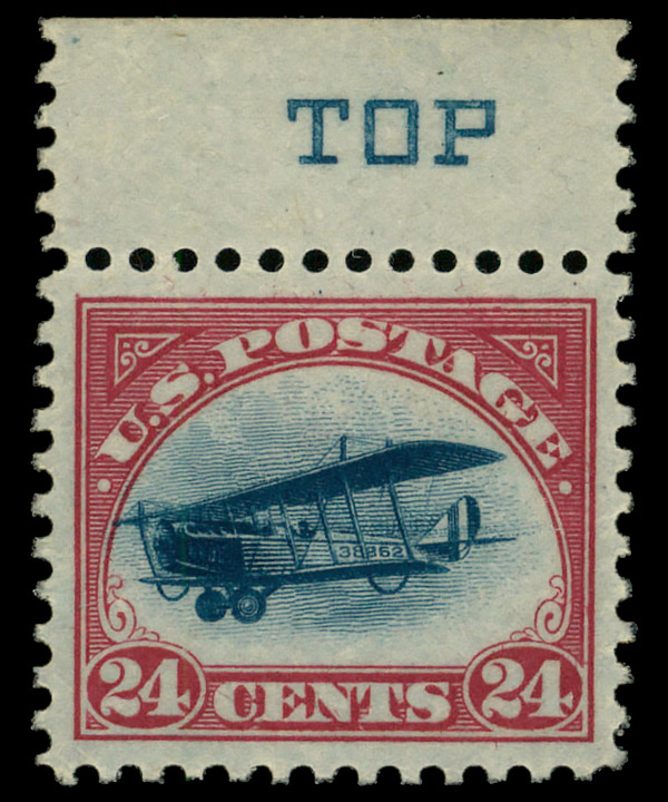 7434 nh C3 imageAirmail, 1918, 24¢ carmine rose & blue (Scott C3), single with blue 'TOP', o.g., never hinged, Extremely Fine to Superb.