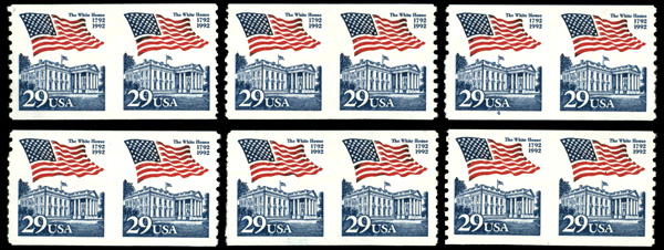 7423 nh 2609b image1992, 29¢ Flag over White House, pair, imperf. between (Scott 2609b), lot of 6 examples, o.g., never hinged, Extremely Fine.