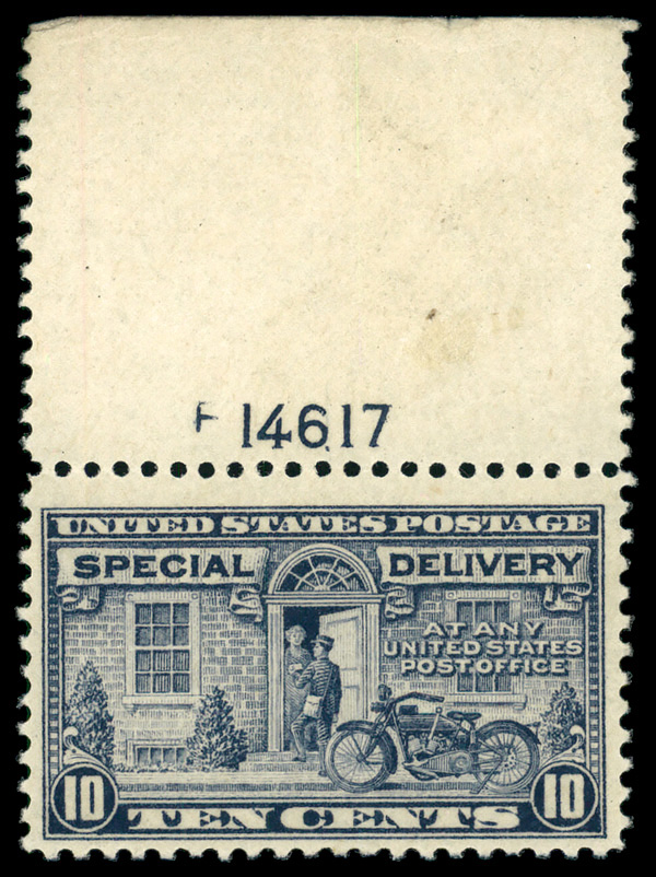 7474 nh E12a imageSpecial Delivery, 1922, 10¢ deep ultramarine (Scott E12a), plate number single, o.g., never hinged, Fine to Very Fine.