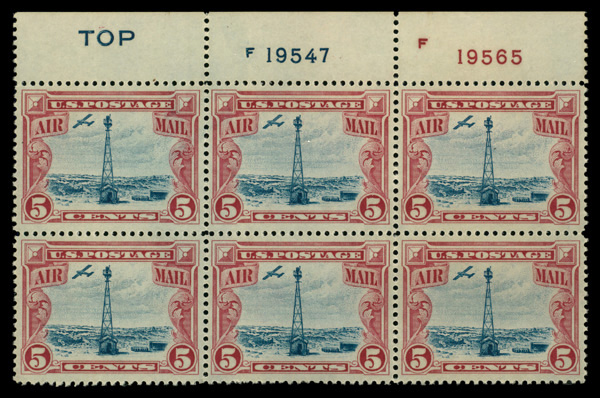 7448 nhbl C11 imageAirmail, 1928, 5¢ Beacon (Scott C11), plate block of 6 with blue 'TOP', o.g., never hinged, Extremely Fine.