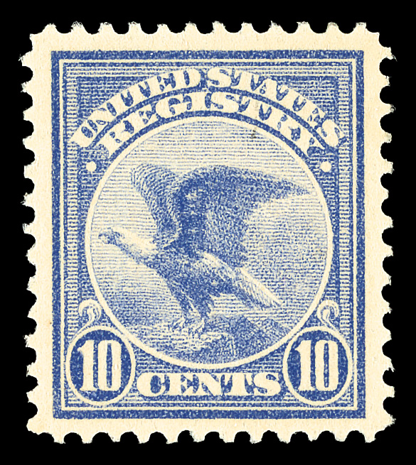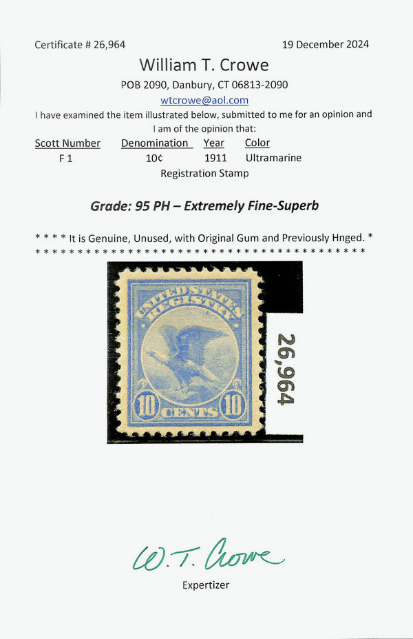 7476 og F1 imageRegistry, 1911, 10¢ ultramarine (Scott F1), o.g., very lightly hinged, a beauty with flawless color, cleanly printed with centering far superior to most, Extremely Fine to Superb, only nine stamps grade higher in PSE's Population Report, with 2024 Crowe certificate graded XF-SUP 95.