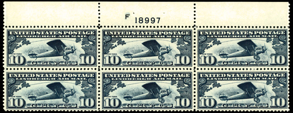 7446 nhbl C10 imageAirmail, 1927, 10¢ Lindbergh (Scott C10), plate block of 6, o.g., never hinged, Very Fine to Extremely Fine.