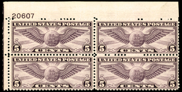 7458 nhbl C16 imageAirmail, 1931, 5¢ Winged Globe, rotary press printing (Scott C16), plate block of 4, o.g., never hinged, Fine to Very Fine.