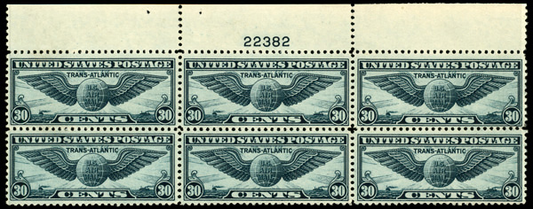 7464 nhbl C24 imageAirmail, 1939, 30¢ Transatlantic (Scott C24), plate block of 6, o.g., never hinged, Very Fine.