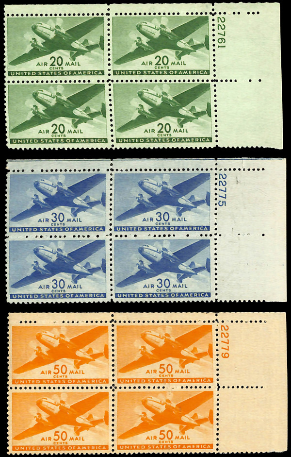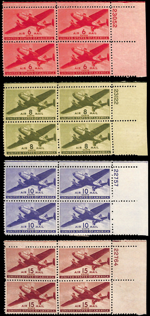 7465 nhbl C25-C31 imageAirmail, 1941-44, Transport complete (Scott C25-C31), set of 7, plate blocks of 4, o.g., never hinged, Extremely Fine.