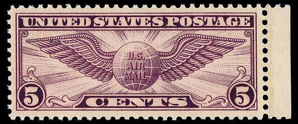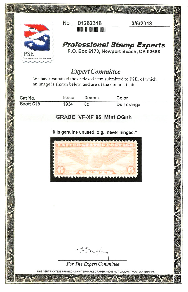 7461 nh C19 imageAirmail, 1934, 6¢ Winged Globe (Scott C19), o.g., never hinged, Very Fine to Extremely Fine, with 2013 P.S.E. certificate graded VF-XF 85.