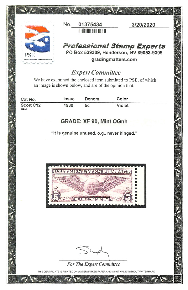 7449 nh C12 imageAirmail, 1930, 5¢ Winged Globe, flat plate printing (Scott C12), o.g., never hinged, Extremely Fine, with 2020 P.S.E. certificate graded XF 90.