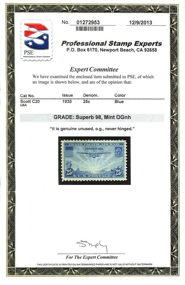 7462 nh C20 imageAirmail, 1935, 25¢ China Clipper (Scott C20), o.g., never hinged, Superb, with 2013 P.S.E. certificate graded SUP 98.