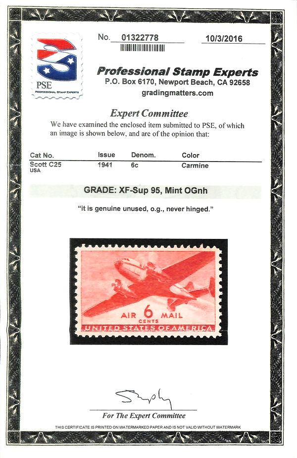 7466 nh C25 imageAirmail, 1941, 6¢ Transport (Scott C25), o.g., never hinged, Extremely Fine to Superb, with 2016 P.S.E. certificate graded XF-SUP 95.