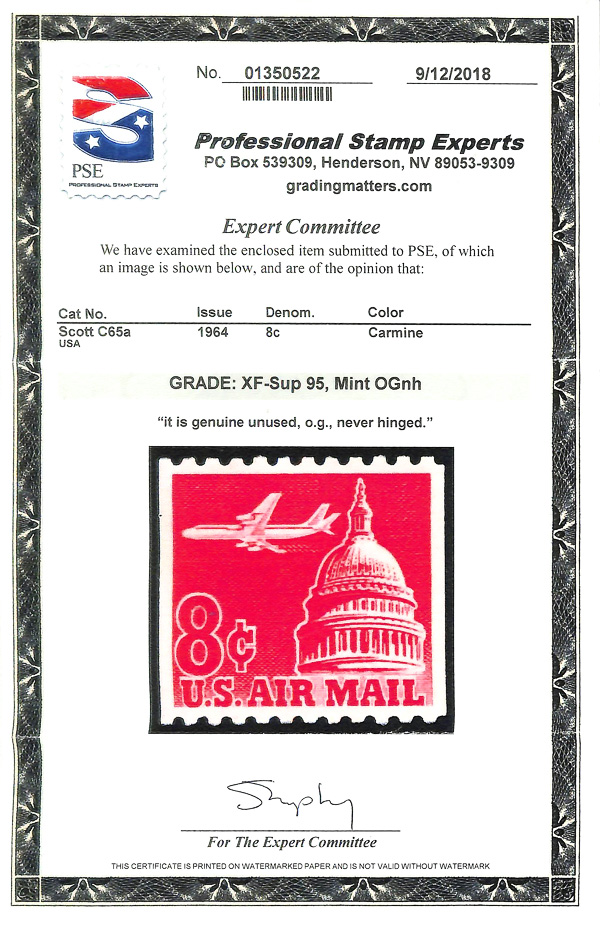 7469 nh C65a imageAirmail, 1962, 8¢ Jet & Capitol coil, tagged (Scott C65a), o.g., never hinged, Extremely Fine to Superb, with 2018 P.S.E. certificate graded XF-SUP 95.