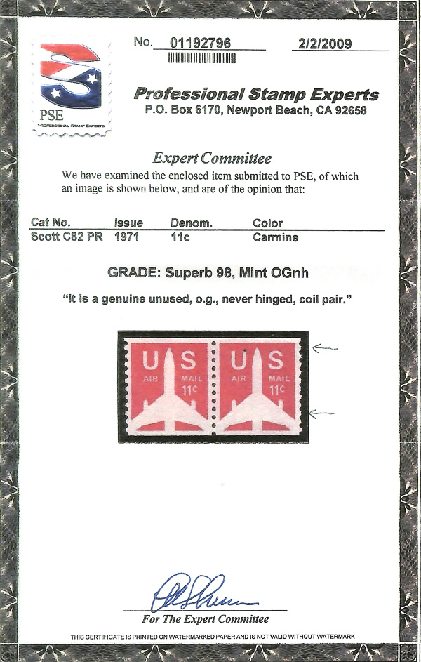 7470 nh C82 imageAirmail, 1971, 11¢ Jet coil (Scott C82), o.g., never hinged, Superb, with photocopy of 2009 P.S.E. certificate graded SUP 98 for pair.
