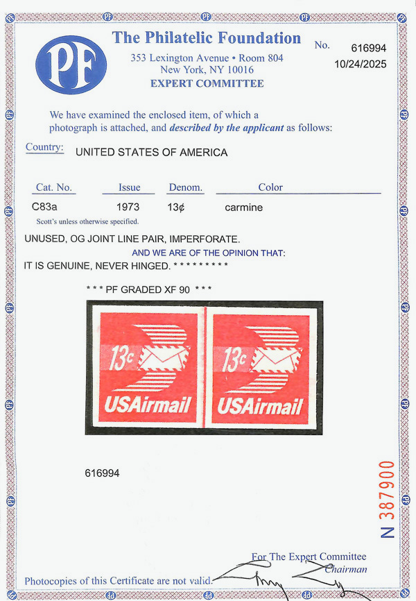 7471 nh C83a imageAirmail, 1973, 13¢ Winged Envelope coil, imperf. pair (Scott C83a), joint line pair, o.g., never hinged, Post Office fresh with solid color and balanced margins all around, Extremely Fine, unpriced in SMQ, with 2025 P.F. certificate graded XF 90.