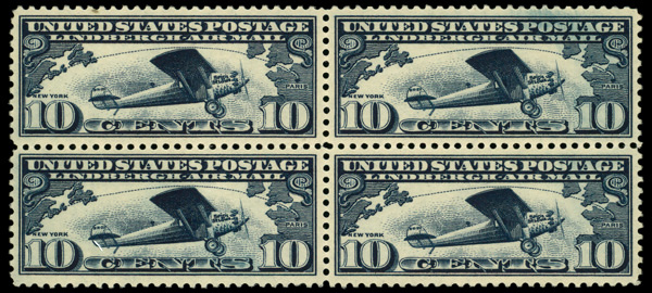 7445 nhbl C10 imageAirmail, 1927, 10¢ Lindbergh (Scott C10), block of 4, o.g., never hinged, Very Fine to Extremely Fine.