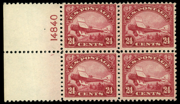 7441 nhbl C6 imageAirmail, 1923, 24¢ carmine (Scott C6), left margin block of 4 with plate number, o.g., never hinged, Fine.