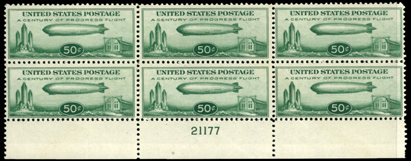 7460 nhbl C18 imageAirmail, 1933, 50¢ "Chicago" Zeppelin (Scott C18), plate block of 6, o.g., never hinged (gum skips), Fine.