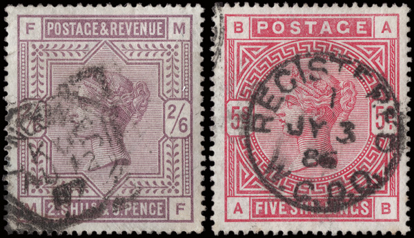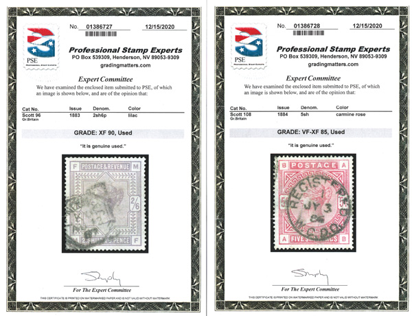 7604 og 96, 108 image1883, Queen Victoria, 2s6d lilac & 1884 5s carmine rose (Scott 96, 108), fresh, well centered and neatly canceled, Very Fine to Extremely Fine, with 2020 P.S.E. certificates, graded XF 90 & VF-XF 85, respectively.