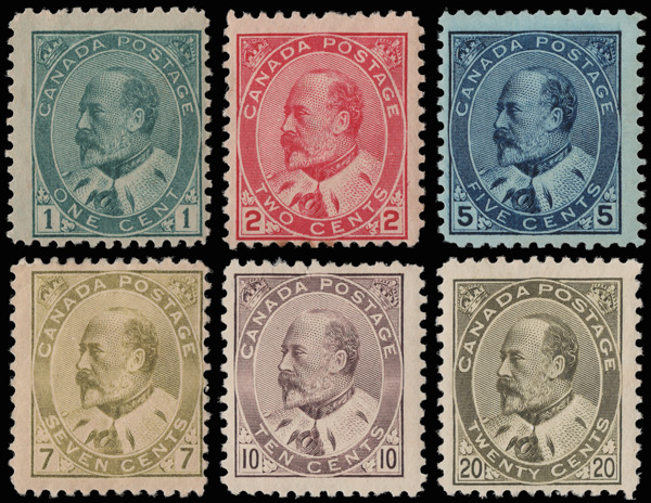 7659 og 89-95 image1903-08, King Edward VII, 1¢ to 50¢ complete (Scott 89-95), a reasonable set, o.g., few hinge remnants; 2¢ with a couple toned perfs, the 50¢—probably the best-centered of the group— has three gum-soaked perfs at the top, otherwise just Fine to otherwise Fine to F-VF, 50¢ with a 2024 P.F. certificate.