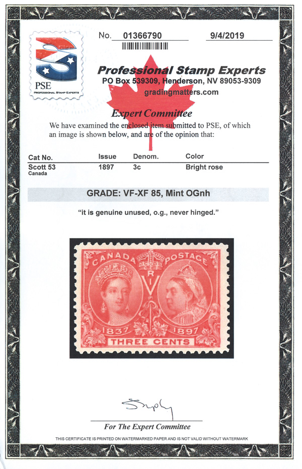 7643 nh 53 image1897, Queen Victoria Jubilee, 3¢ bright rose (Scott 53), o.g., never hinged, bright, fresh and very well centered, Very Fine to Extremely Fine, with a 2019 P.S.E. certificate graded VF-XF 85,.