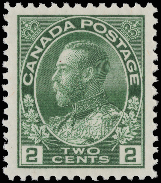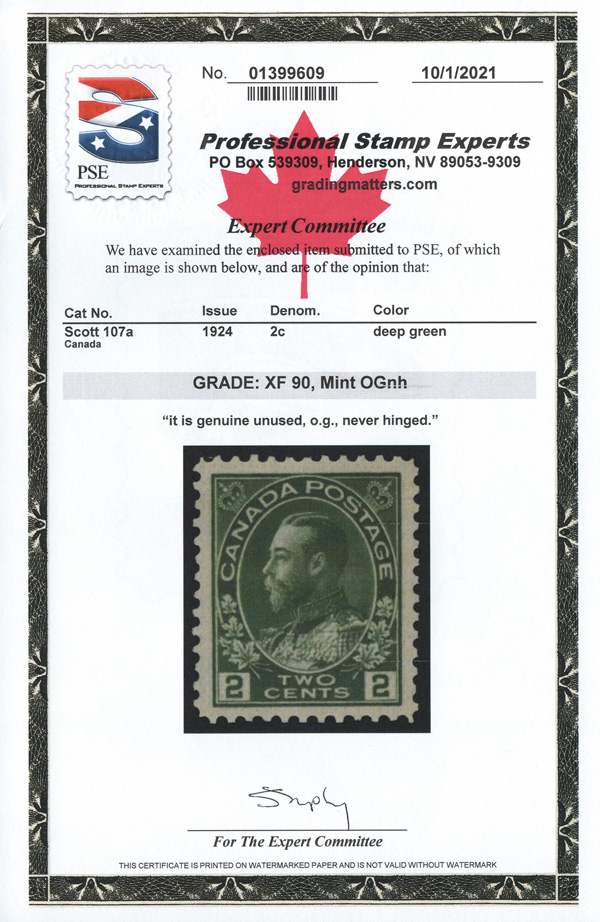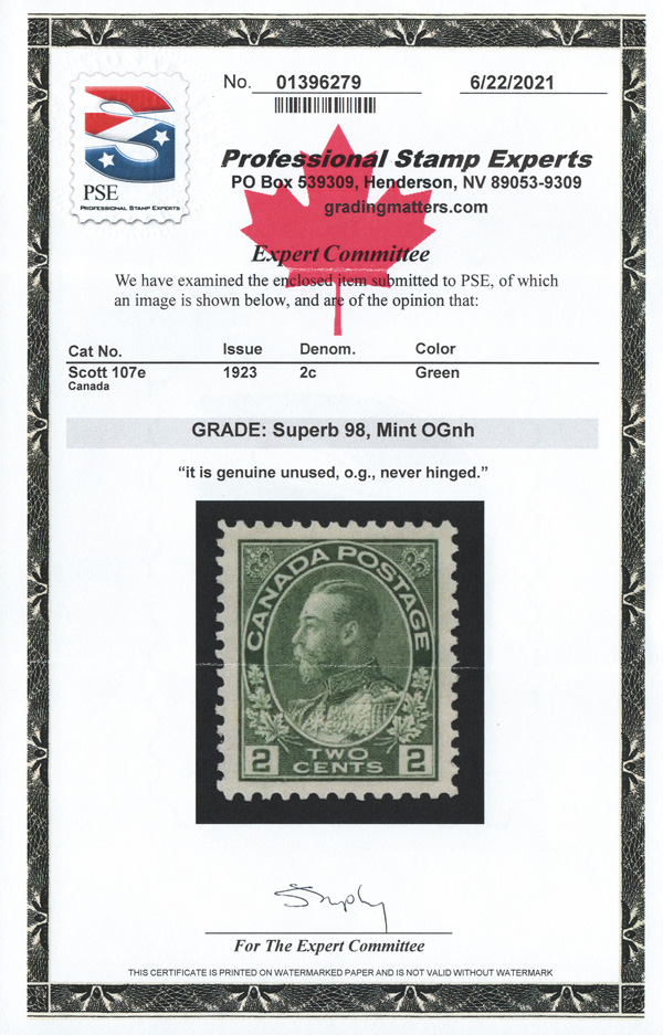 7668 nh 107e image1923, King George V "Admiral", 2¢ green, dry printing (Scott 107e), an extraordinary mint single, o.g., never hinged, bright and fresh and mathematically centered, Superb. 107e is unpriced by SMQ, with a 2019 P.S.E. certificate graded GEM 100.
