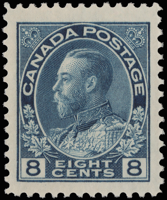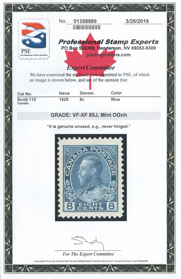 7675 nh 115 image1925, King George V "Admiral", 8¢ blue (Scott 115), o.g., never hinged, fresh and beautifully centered with extra large margins, Very Fine to Extremely Fine, with a 2019 P.S.E. certificate graded VF-XF 85 J.