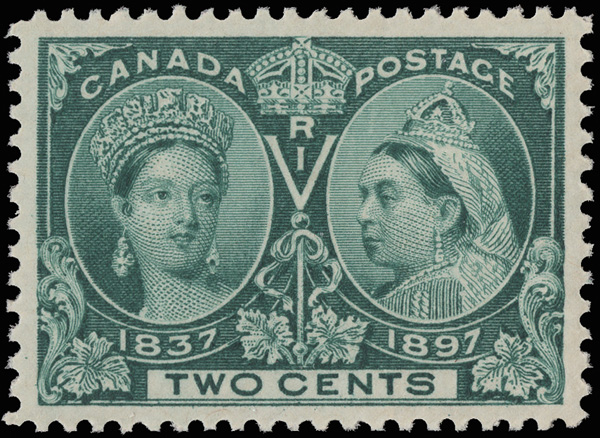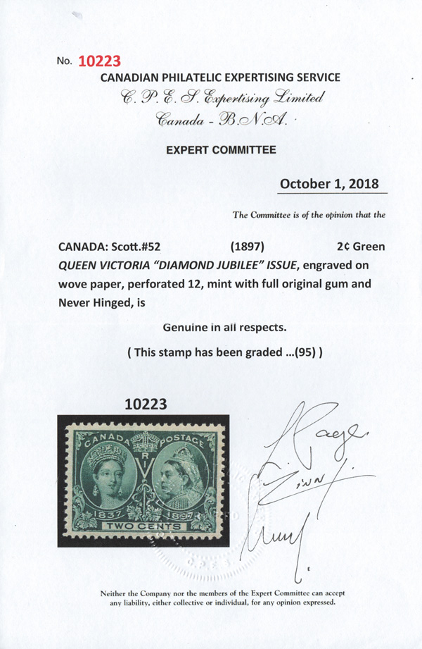 7642 nh 52 image1897, Queen Victoria Jubilee, 2¢ green (Scott 52), o.g., never hinged, virtually perfectly centered, fresh and choice, Extremely Fine, with a 2018 C.P.E.S. certificate graded "95".