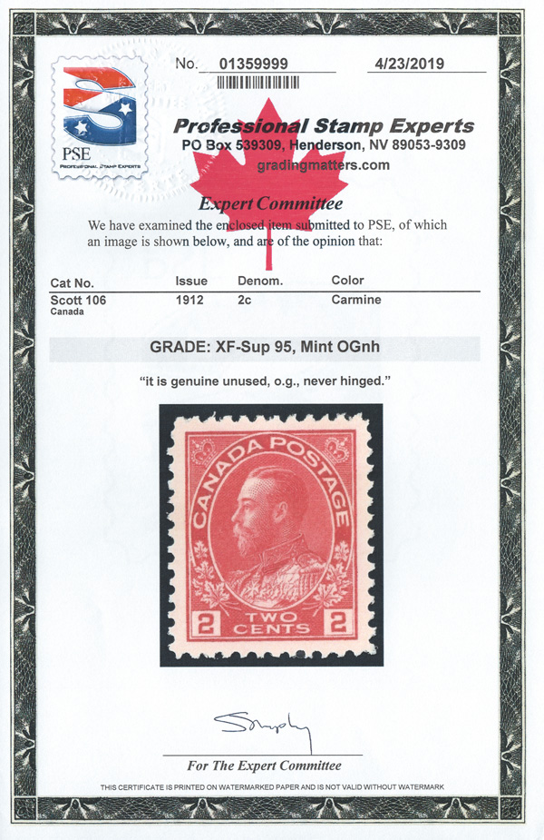 7664 nh 106 image1912, King George V "Admiral", 2¢ carmine (Scott 106), o.g., never hinged, wonderfully fresh and beautifully centered, Extremely Fine to Superb, with a 2019 P.S.E. certificate graded XF-SUP 95.