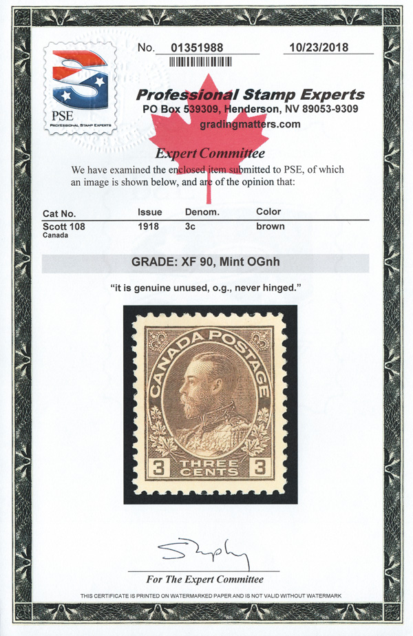 7669 nh 108 image1918, King George V "Admiral", 3¢ brown, wet printing (Scott 108), a gorgeous mint single, o.g., never hinged, wonderfully fresh and perfectly centered, Extremely Fine, with a 2018 P.S.E. certificate graded XF 90.