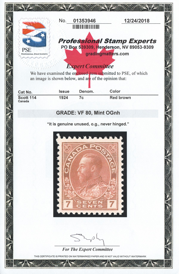 7673 nh 114 image1924, King George V "Admiral", 7¢ red brown, dry printing (Scott 114), o.g., never hinged, fresh and well centered, Very Fine, with a 2018 P.S.E. certificate graded VF 80.