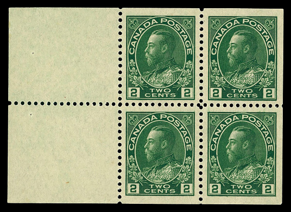 7667 BKnh 107b image1922, King George V "Admiral", 2¢ yellow green, booklet pane of 4 + 2 labels (Scott 107b), o.g., never hinged, Very Fine to Extremely Fine.